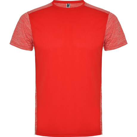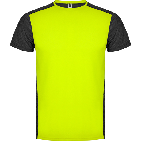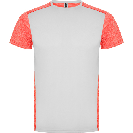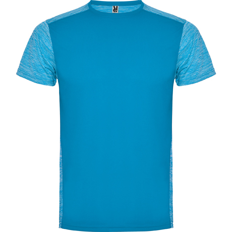 Camiseta técnica de manga corta con cuello redondo. Combinada en espalda, hombros y mangas con dos tejidos de poliéster. Tejido principal frontal bird´s eye y tejido space dye en la parte trasera. Patronaje en la espalda ligeramente mas largo.
