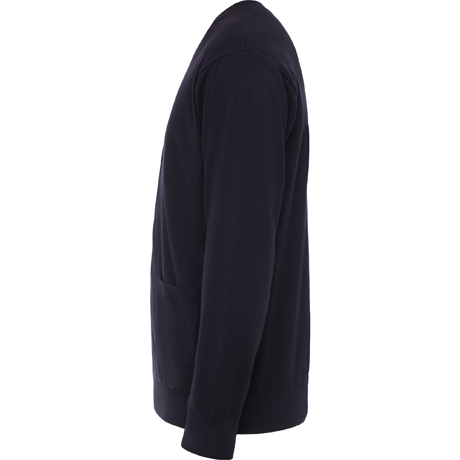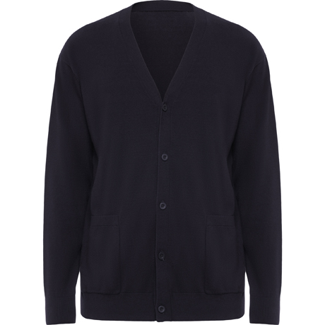 Chaqueta con escote de pico para hombre. · Tejido en punto suave. · Cierre central de cinco botones al tono. · Dos bolsillos de plastón. · Puños y cintura elásticos en punto canalé.