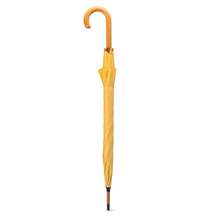 Paraguas de 23 inch. Apertura automatica. Fabricado en poliéster 190T con eje y puntas de madera. Costillas chapado metálico negro. Mango curvado de madera acabado natural. Cierre manual.