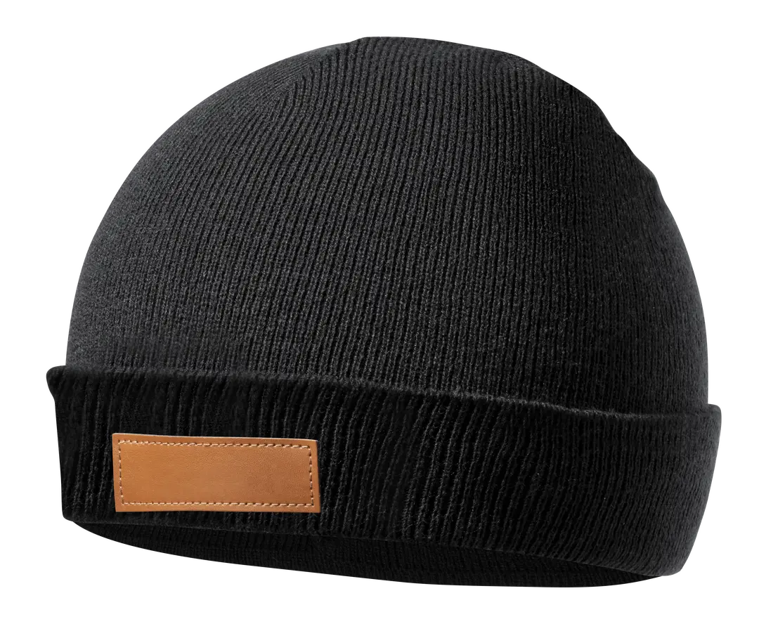 Set de gorro y guantes en talla adulto, fabricados en material acrílico elástico y con parche en polipiel cosido para marcaje. Incluye: Par de guantes con 3 dedos táctiles y elástico de ajuste en muñeca. Gorro a juego con dobladillo.