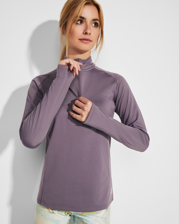 Sudadera técnica de manga larga ranglán para mujer. Interior perchado. Cubrecosturas reforzado en cuello. Media cremallera invertida a tono. Ojales en los puños para el pulgar. Costuras overlock en manga ranglán y paneles laterales. Logo Roly reflectante en panel lateral izquierdo.