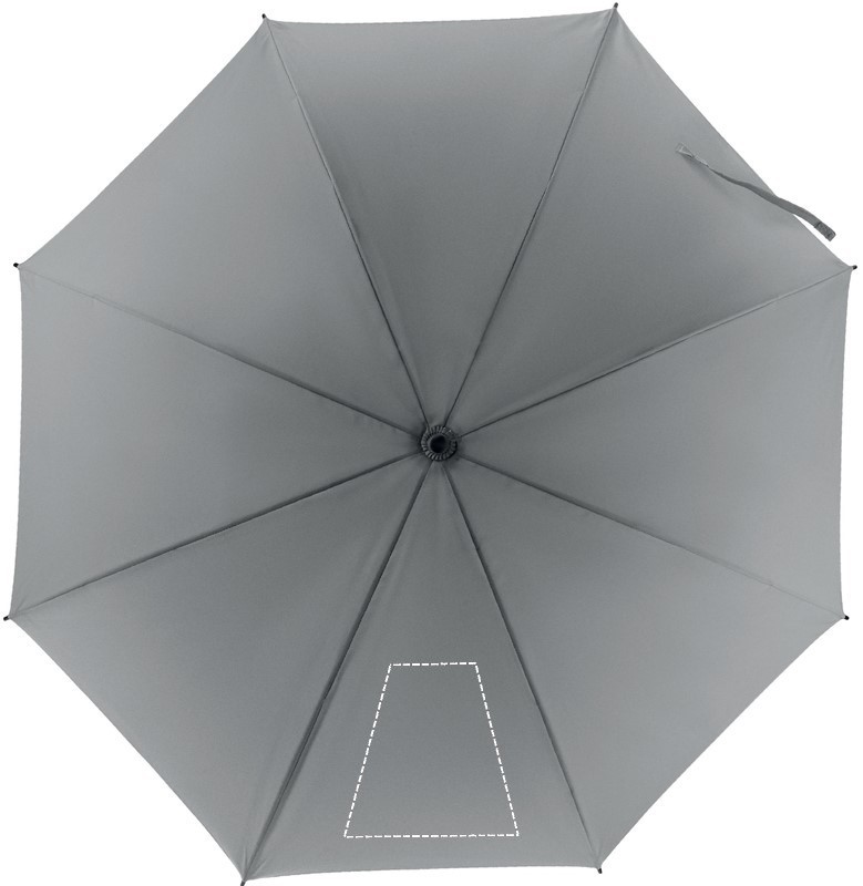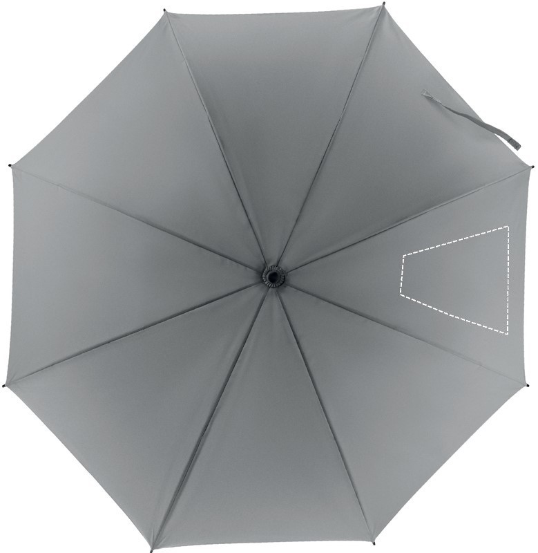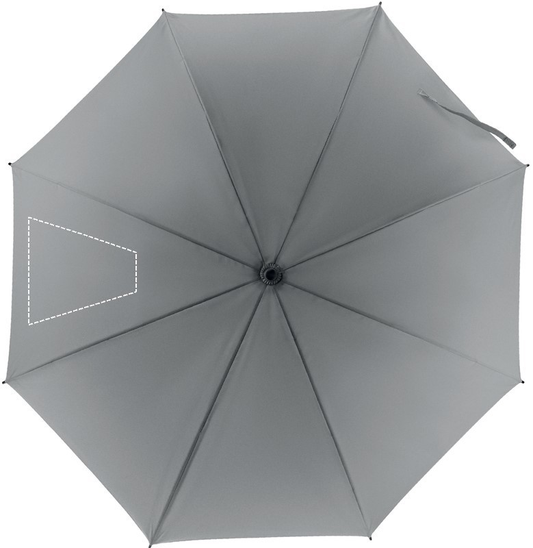 Paraguas de 23'' de apertura manual en poliéster de altamente reflectante con eje y varillas de fibra de vidrio. Puntas y parte superior de plástico negro. Mango de goma negra.